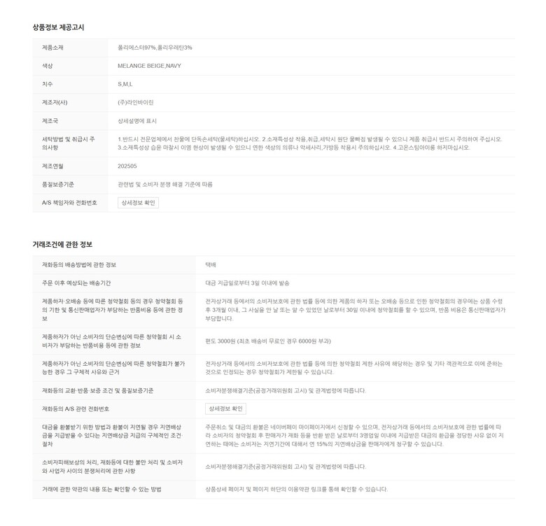 1. 제품 소재 (섬유의 조성 또는 혼용률을 백분율로 표시, 기능성인 경우 성적서 또는 허가서) 상품상세참조