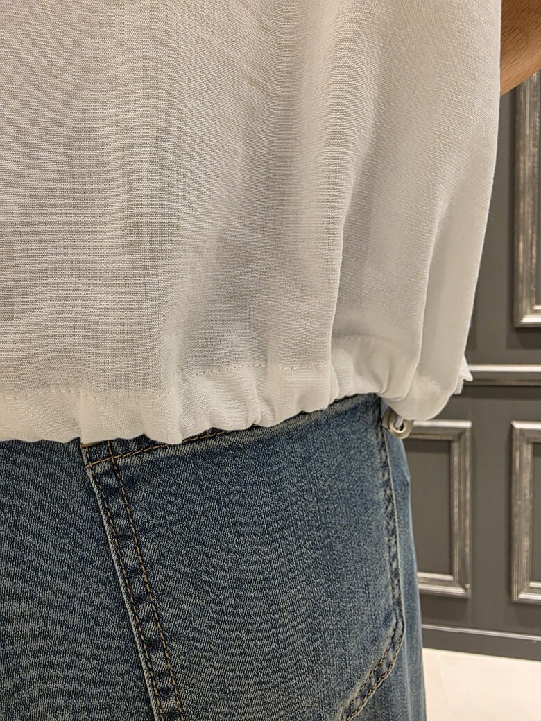 드롭소매 디자인의 밑단 스트링으로 캐주얼하게 연출하시기 좋으며?스트링 라인없이 연출하시면 숏 스타일링하시기 좋은 여름 베스트 아이템입니다?