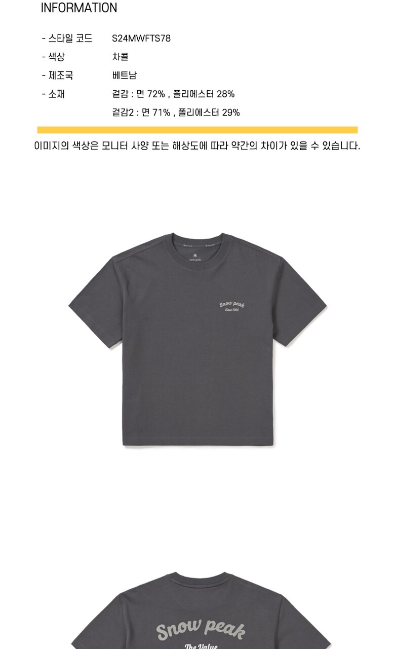 스노우피크 에어로쿨 여성 컬러 세미크롭 반팔티 S24MWFTS78-CC