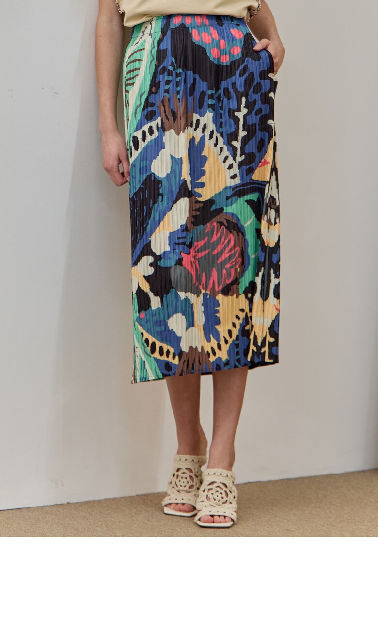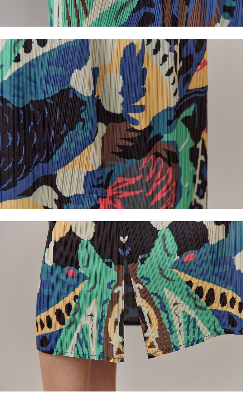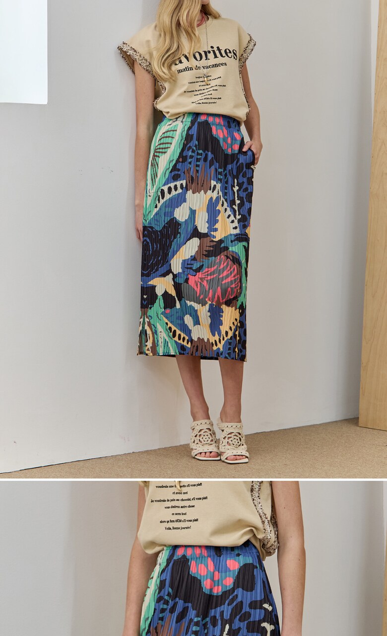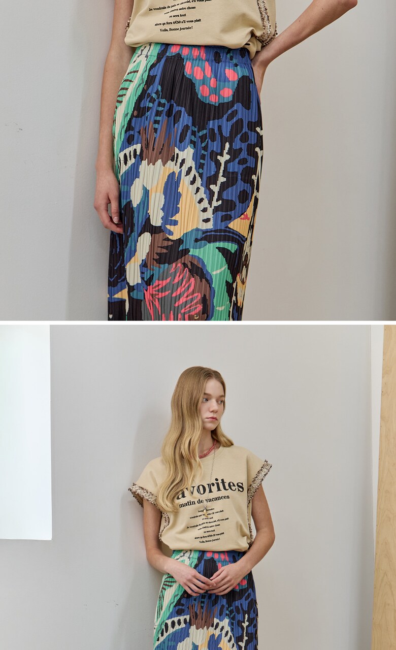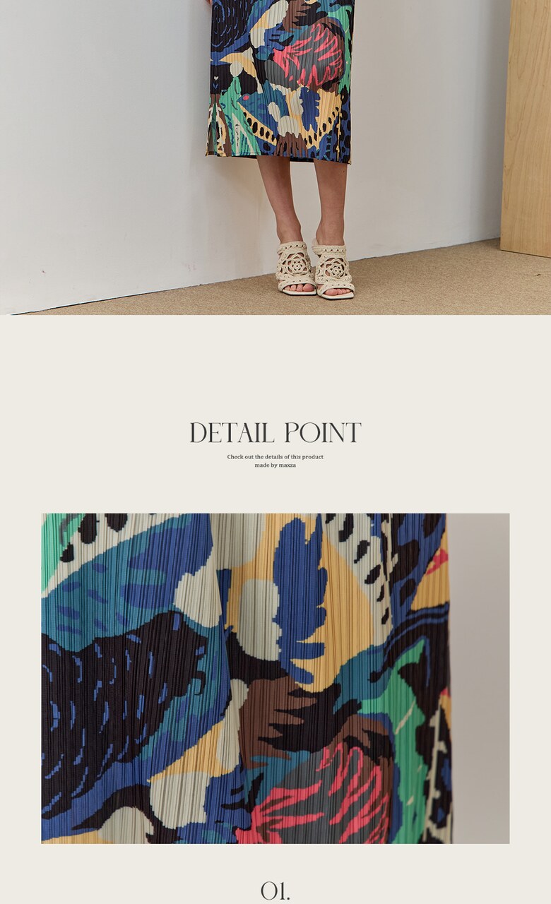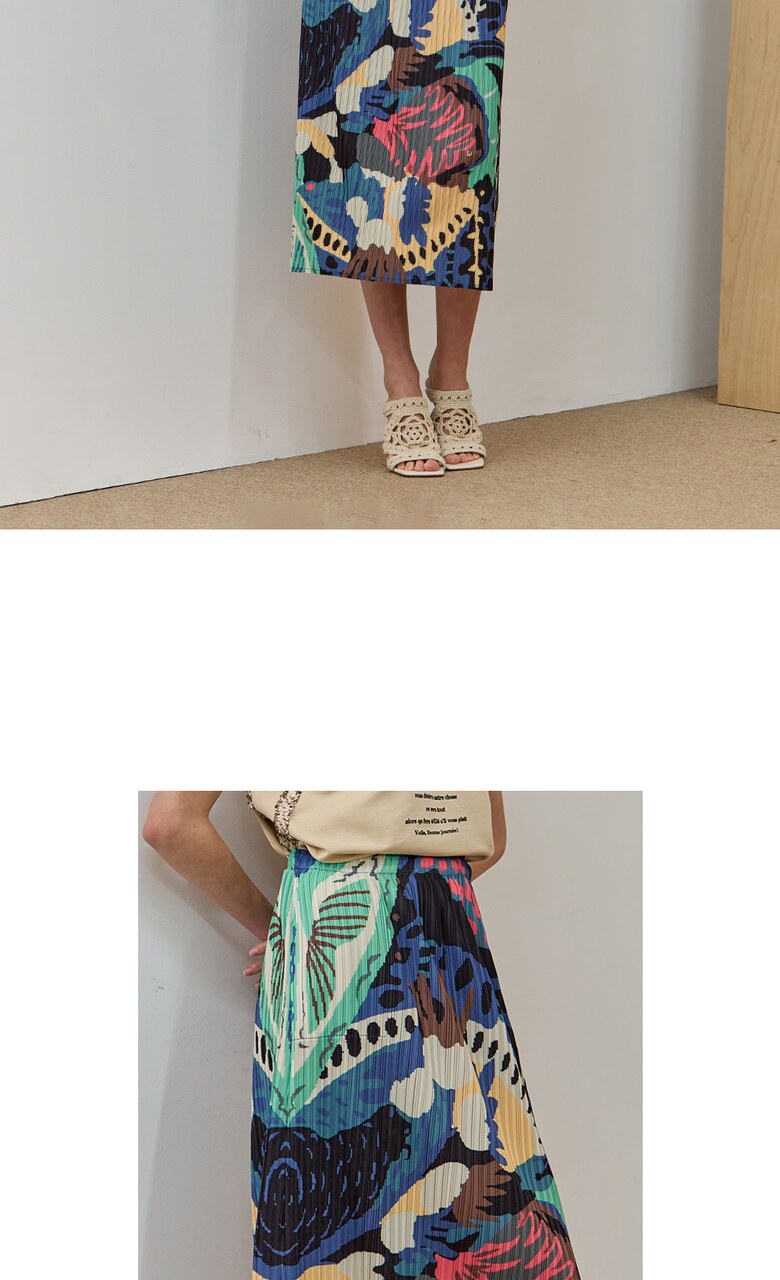 트로피컬 그래픽 패턴 밴딩 플리츠 롱 스커트