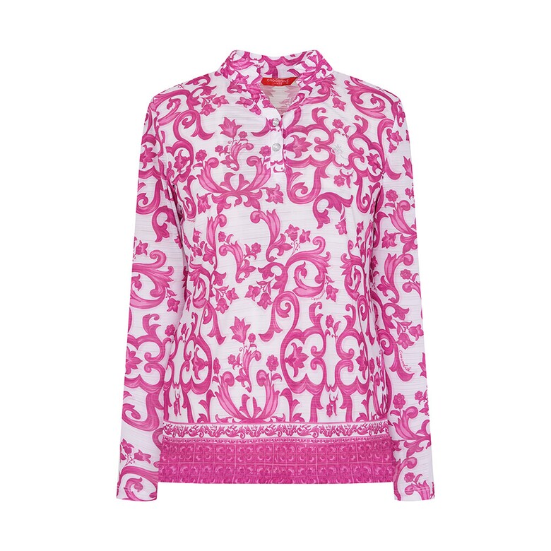번수차 소재를 사용해 시원하고 편안한 착용감을 주며 전판 보더스타일의 기하학 프린트가 포인트인 크로커 시그니처 와이어 카라 티셔츠