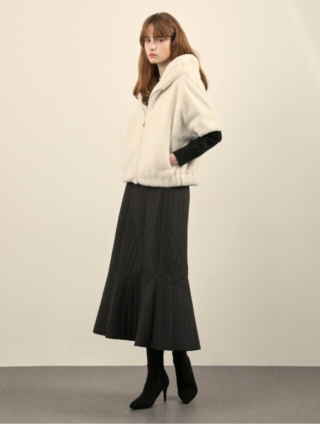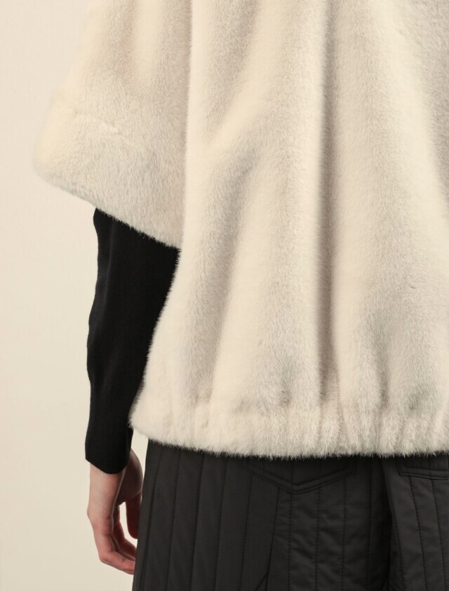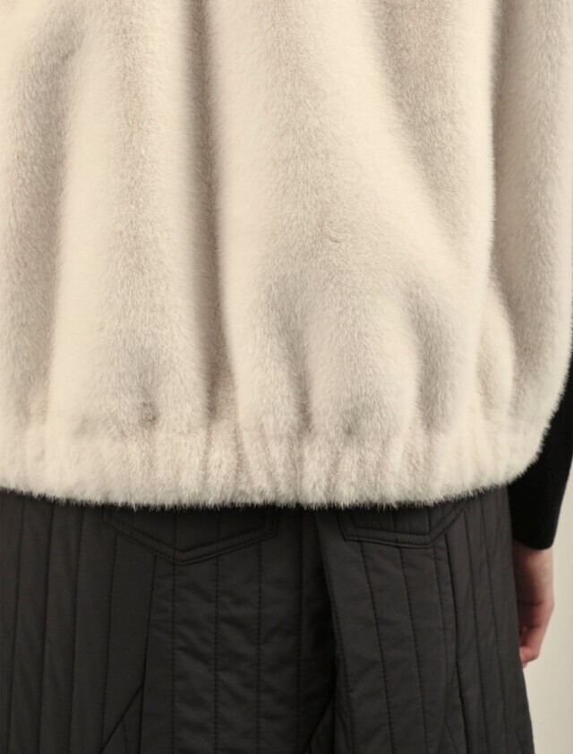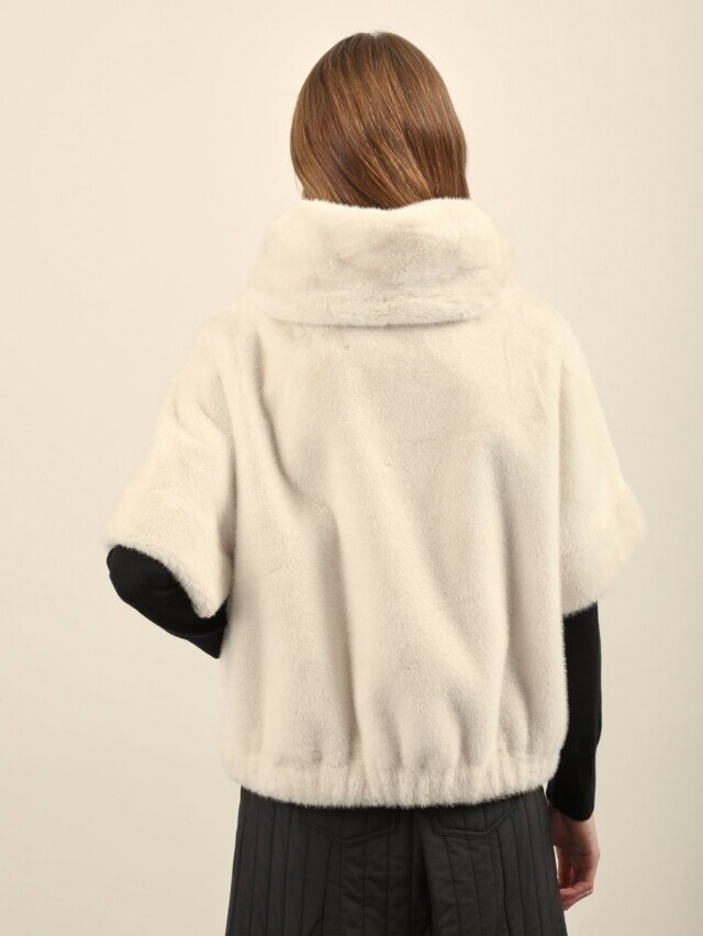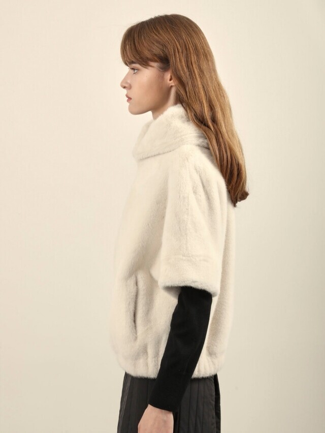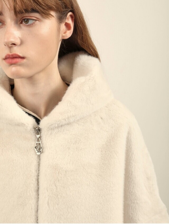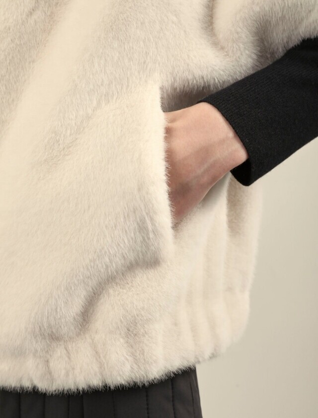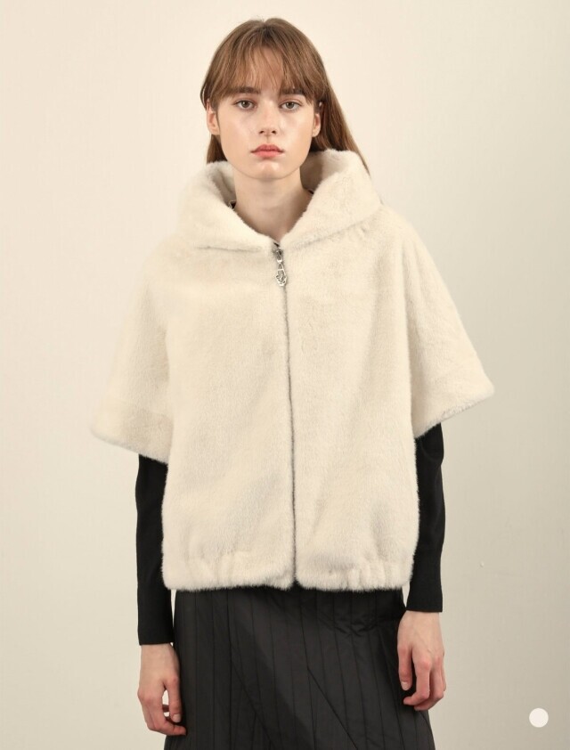 아이보리 컬러의 반팔 부르종 인조퍼 점퍼로 부트럽고
