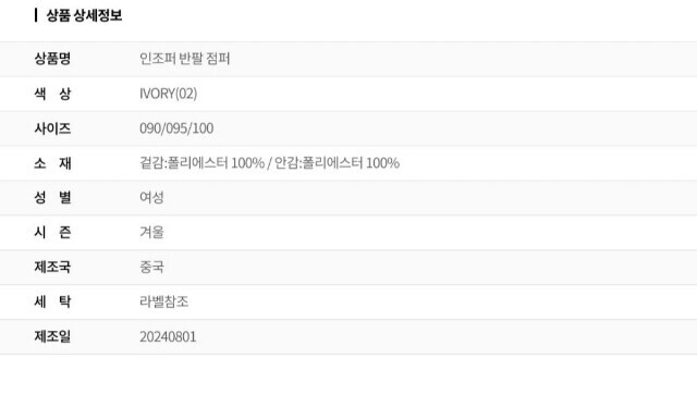 | 1. 제품 소재 (섬유의 조성 또는 혼용률을 백분율로 표시, 기능성인 경우 성적서 또는 허가서) | 상품상세참조 |