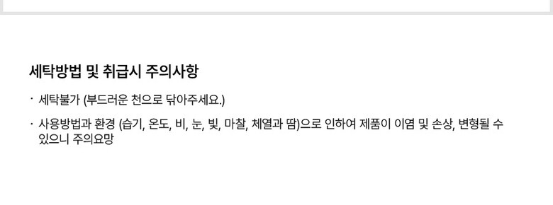 7. 취급시 주의사항 | 열이나 직사광선, 습기에 주의하고, 부드러운 소재를 사용하여 닦아주시기 바랍니다. |