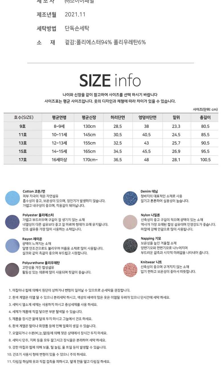 1. 제품 소재 (섬유의 조성 또는 혼용률을 백분율로 표시, 기능성인 경우 성적서 또는 허가서) | 겉감:폴리에스터94% 폴리우레탄6% |