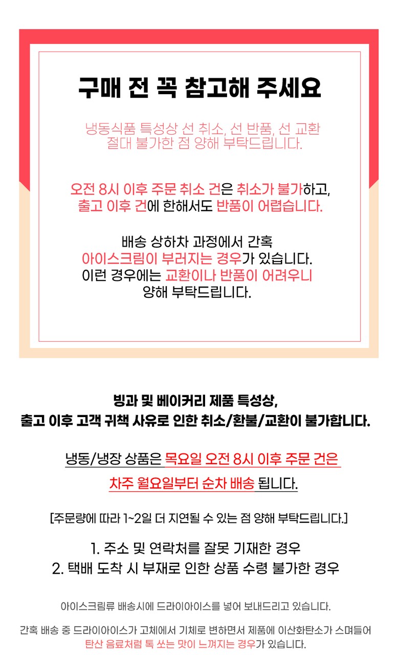 4. 생산일자,유통기한 | 1.냉장:상시제조/소비기한은 제조 일자로부터 7일 입니다.2.실온/냉동 제조연월일 :상시 제조 상품으로 잔여 소비기한이 3분의 1이상인 제품으로 출고되고 있으며, 소비 기한이 비교적 짧은 제품은 최소 13달이상 남은 제품으로 출고됩니다. |