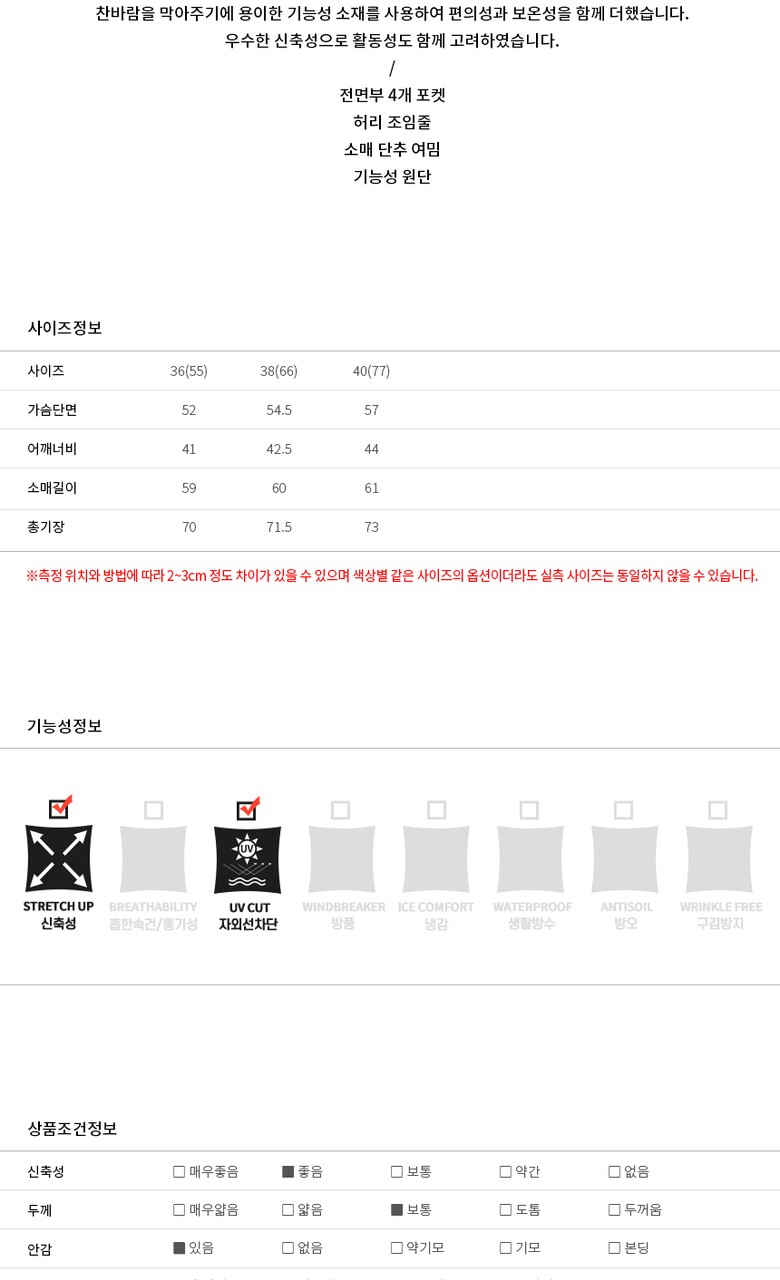 1. 제품 소재 (섬유의 조성 또는 혼용률을 백분율로 표시, 기능성인 경우 성적서 또는 허가서) | 겉감:나일론84%,폴리우레탄16% 안감1:폴리에스터94%,폴리우레탄6% 안감2:폴리에스터100% |