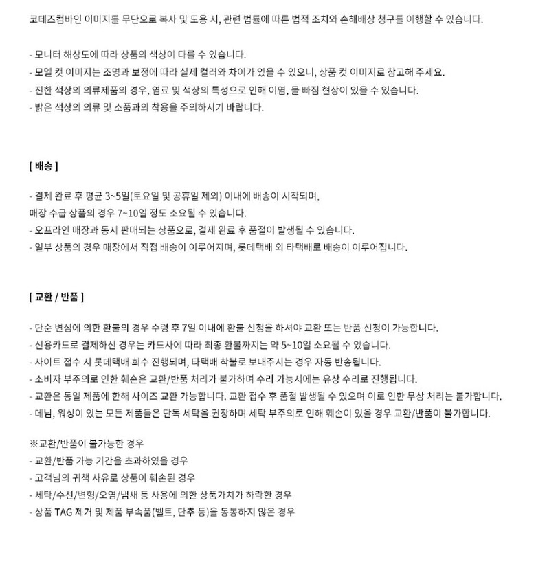 • 처음 배송된 상품상태와 다를 경우(세탁/착용 후 외출하신 경우) 반품이 불가합니다.