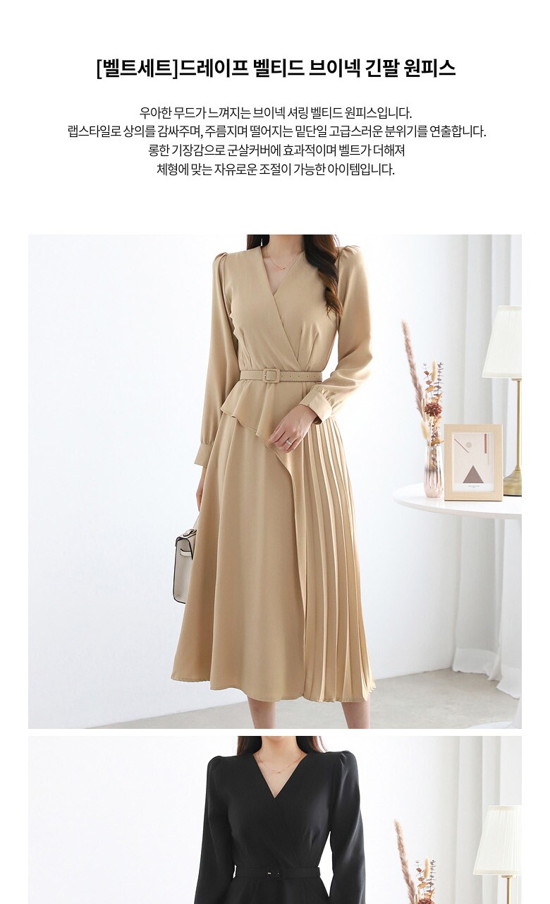 드레이프 벨티드 브이넥 긴팔 원피스_PM2509OP607C