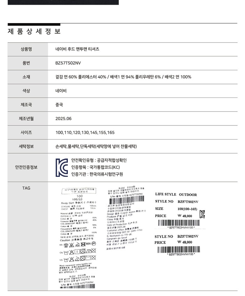 | 1. 제품 소재 (섬유의 조성 또는 혼용률을 백분율로 표시, 기능성인 경우 성적서 또는 허가서) | 겉감 면 60% 폴리에스터 40% / 배색1 면 94% 폴리우레탄 6% / 배색2 면 100% |