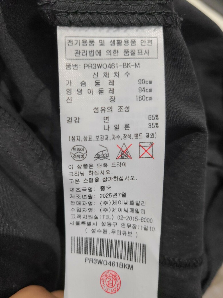 1. 제품 소재 (섬유의 조성 또는 혼용률을 백분율로 표시, 기능성인 경우 성적서 또는 허가서) 겉감:면 65%, 나일론 35%