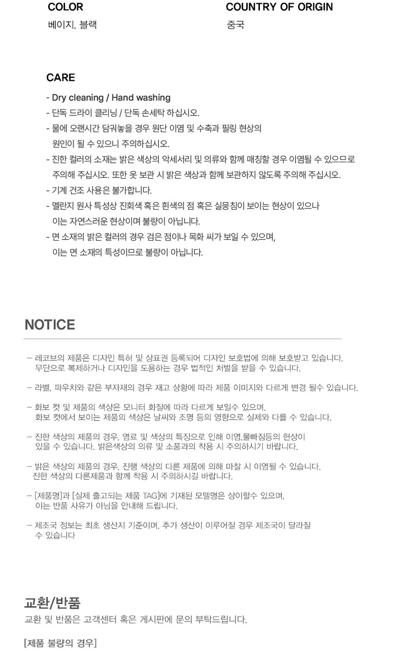 • 처음 배송된 상품상태와 다를 경우(세탁/착용 후 외출하신 경우) 반품이 불가합니다.