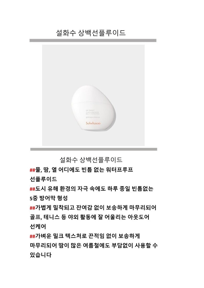 | 7. 주요성분 | 정제수, 프로판디올, 스쿠알란, 백화사설초추출물, 디메치콘, 부틸렌글라이콜, 감초추출물, 메도우폼씨오일, 글리세린, 작약추출물, 연꽃추출물, 옥죽추출물, 마돈나백합비늘줄기추출물, 지황추출물, 꿀, 녹차추출물, 인삼추출물, 하이드롤라이즈드인삼사포닌, 뽕나무뿌리추출물, 쉐어버터, 1, 2-헥산디올, C12-20알킬글루코사이드, C14-22알코올, 글리세릴스테아레이트, 글리세릴카프릴레이트, 라우릭애씨드, 메톡시피이지-114/폴리엡실론카프롤락톤, 미리스틱애씨드, 베헤닐알코올, 스테아릭애씨드, 아라키딜글루코사이드, 아라키딜알코올, 에칠헥실글리세린, 잔탄검, 카보머, 카프릴릴글라이콜, 트로메타민, 팔미틱애씨드, 하이드로제네이티드레시틴, 디소듐이디티에이, 페녹시에탄올, 향료, 제라니올, 시트랄, 리날룰, 시트로넬올, 리모넨 확인 |