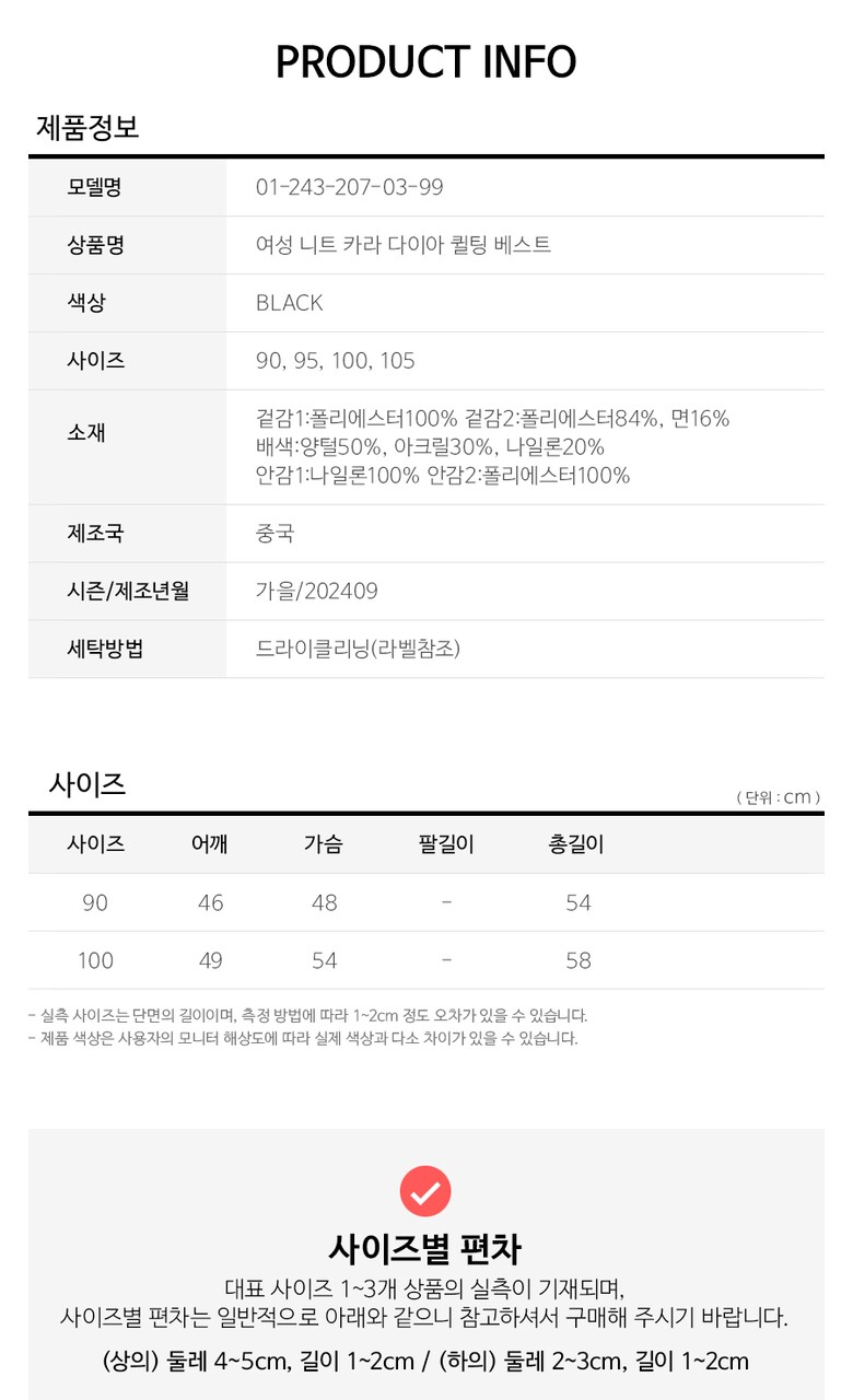 [보그너] 여성 니트 카라 다이아 퀼팅 베스트 BLACK