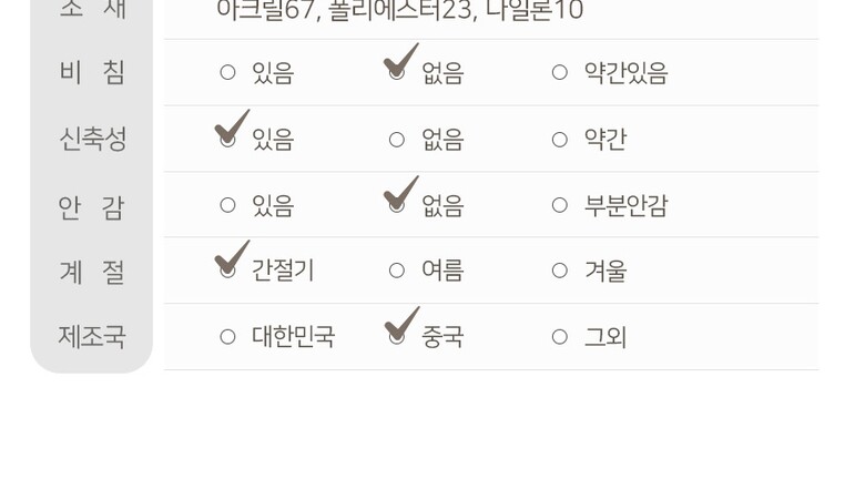 1. 제품 소재 (섬유의 조성 또는 혼용률을 백분율로 표시, 기능성인 경우 성적서 또는 허가서) | 상세페이지 참조 |