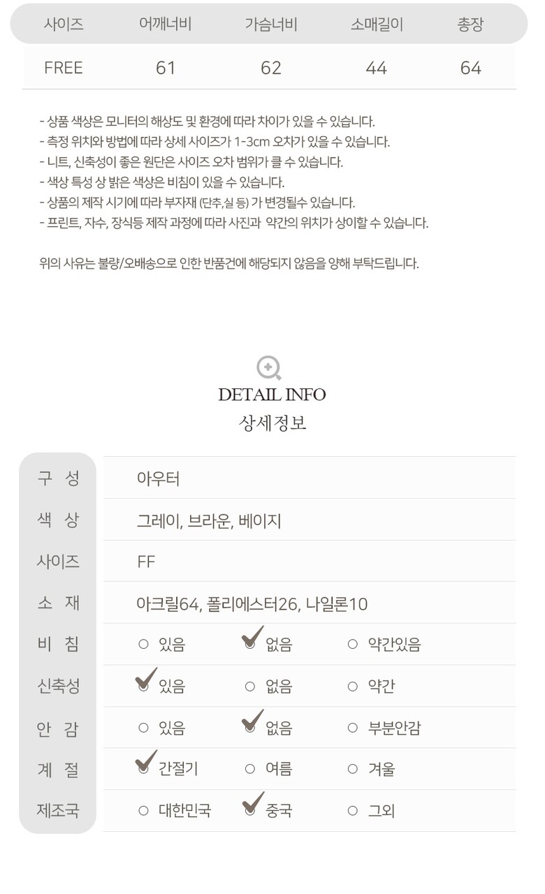 1. 제품 소재 (섬유의 조성 또는 혼용률을 백분율로 표시, 기능성인 경우 성적서 또는 허가서) | 상세페이지 참조 |