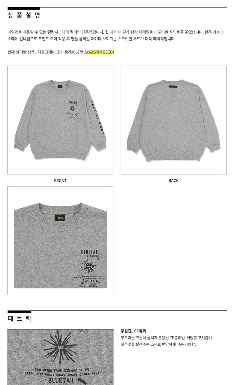 #블루테일 #티셔츠 #맨투맨 #후드티 #AZG7TS12MG #블루테일 #BLUETAIL