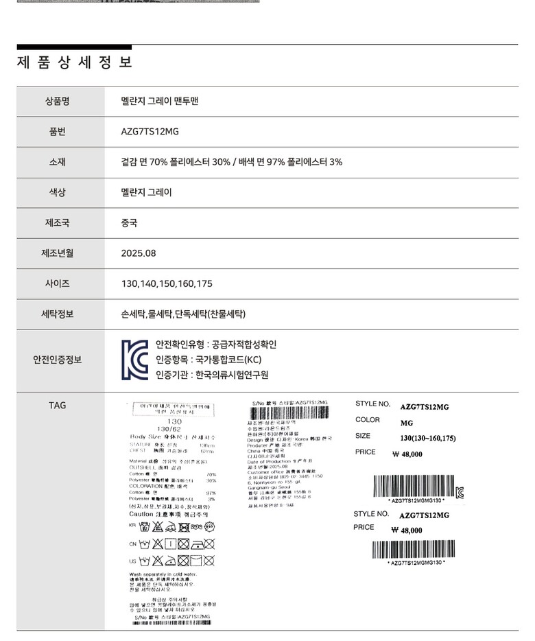 제품소재 : 겉감 면 70% 폴리에스터 30% / 배색 면 97% 폴리에스터 3%
