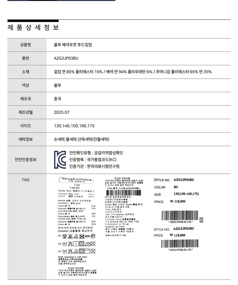 제품소재 : 겉감 면 85% 폴리에스터 15% / 배색 면 94% 폴리우레탄 6% / 주머니감 폴리에스터 65% 면 35%
