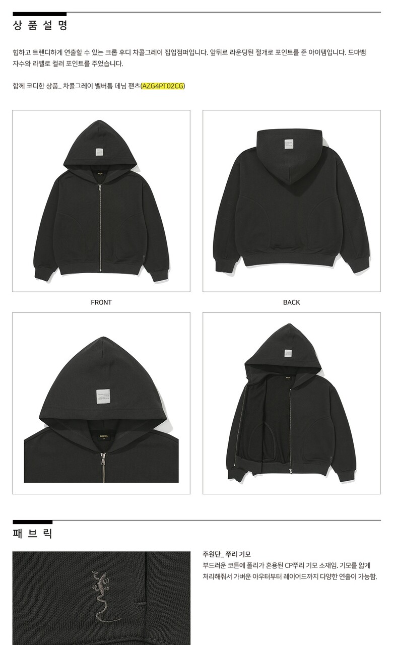 제품소재 : 겉감 면 85% 폴리에스터 15% / 배색 면 94% 폴리우레탄 6% / 주머니감 폴리에스터 65% 면 35%