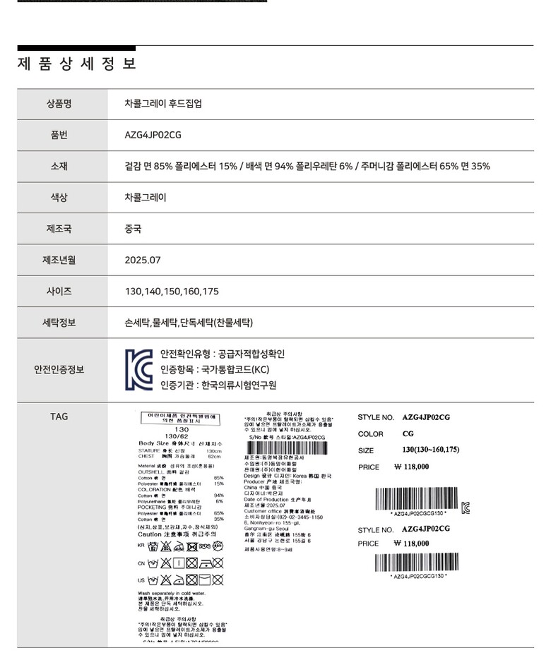 5. 제조국 | 겉감 면 85% 폴리에스터 15% / 배색 면 94% 폴리우레탄 6% / 주머니감 폴리에스터 65% 면 35% |