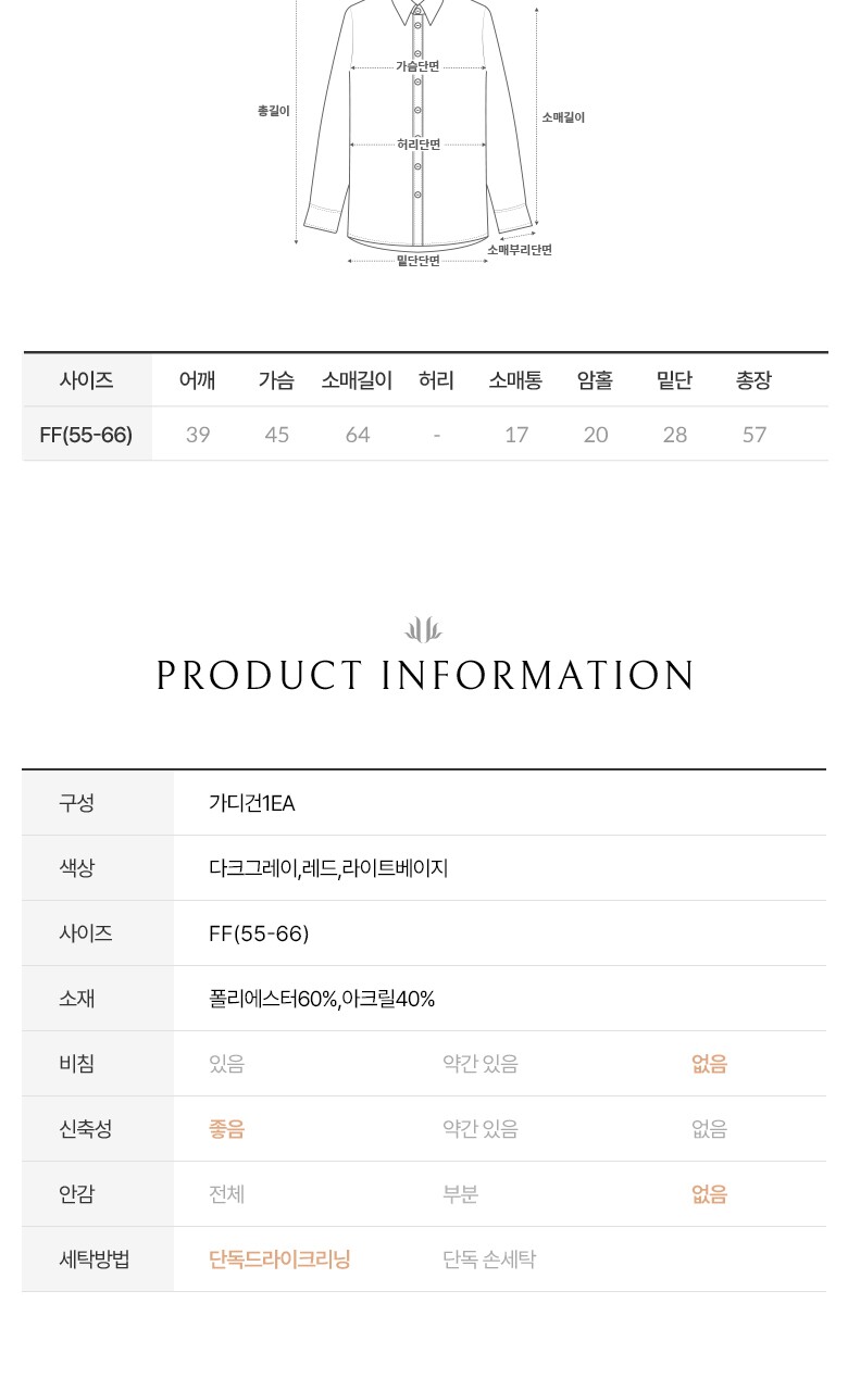 1. 제품 소재 (섬유의 조성 또는 혼용률을 백분율로 표시, 기능성인 경우 성적서 또는 허가서) | 폴리에스터60%,아크릴40% |