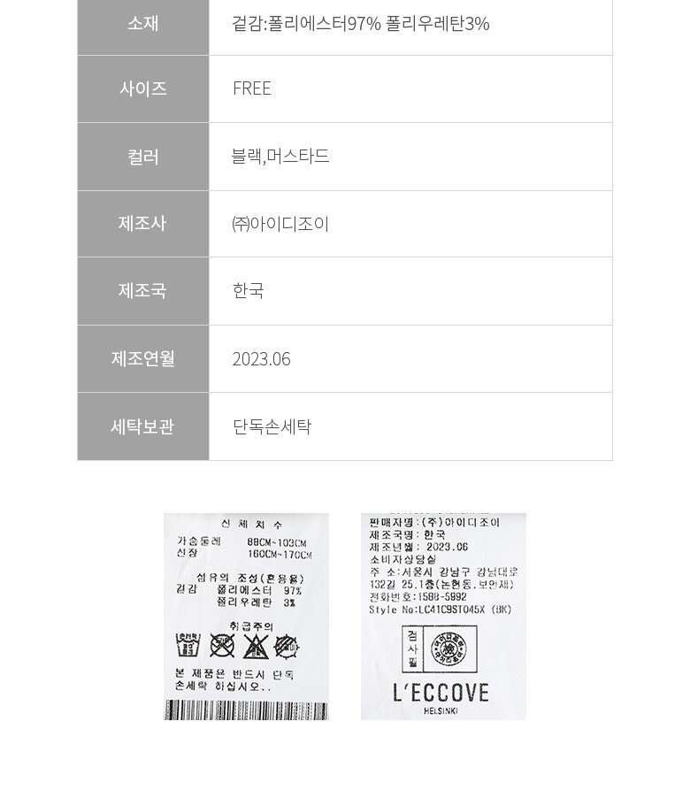 1. 제품 소재 (섬유의 조성 또는 혼용률을 백분율로 표시, 기능성인 경우 성적서 또는 허가서) | 상세페이지 참조 |