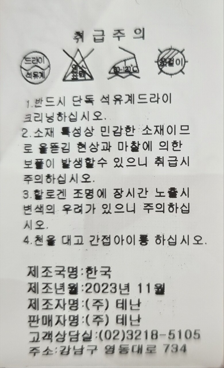 6. 세탁방법 및 취급시 주의사항 1.반드시 단독 석유계 드라이크리닝하십시오. 2.소재 특성상 민감한 소재이므로 올뜯김 현상과 마찰에 의한 보풀이 발생할 수 있으니 취급시 주의하십시오. 3.할로겐 조명에 장시간 노출시 변색의 우려가 있으니 주의하십시오. 4.천을 대고 간접아이롱 하십시오.