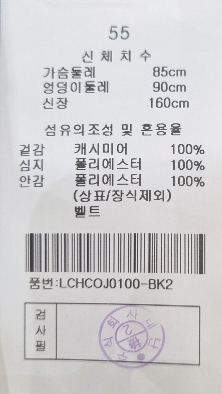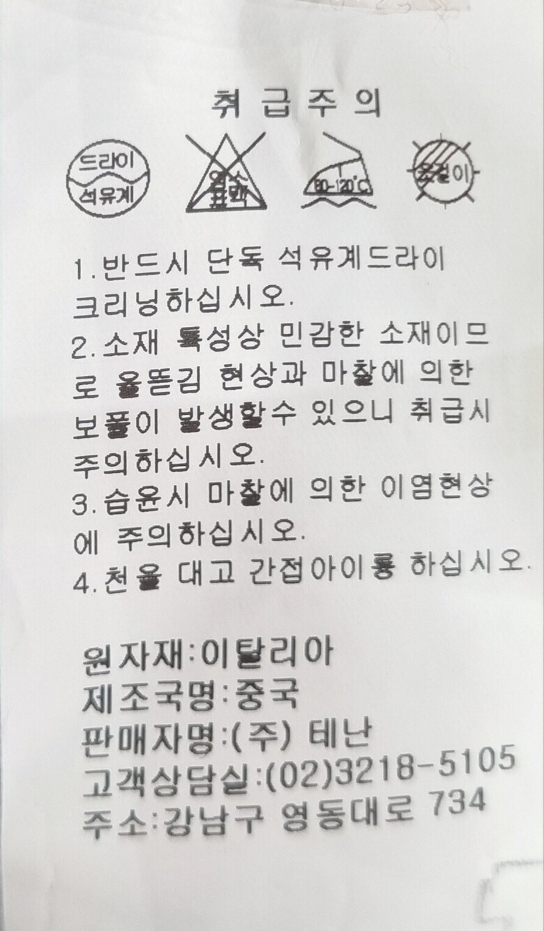 | 6. 세탁방법 및 취급시 주의사항 | 1.반드시 단독 석유계 드라이크리닝하십시오. 2.소재 특성상 민감한 소재이므로 올뜯김 현상과 마찰에 의한 보풀이 발생할수 있으니 취급시 주의하십시오. 3.습윤시 마찰에 의한 이염현상에 주의하십시오. 4.천을 대고 간접아이롱 하십시오. |