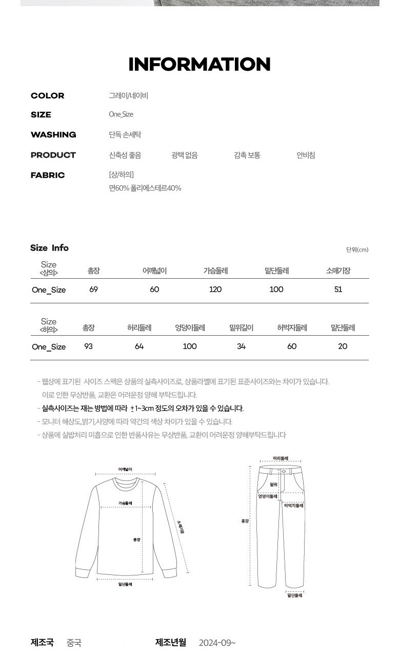 1. 제품 소재 (섬유의 조성 또는 혼용률을 백분율로 표시, 기능성인 경우 성적서 또는 허가서) | [상/하의] 면60% 폴리에스테르40% |