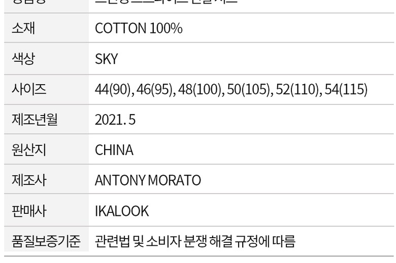1. 제품 소재 (섬유의 조성 또는 혼용률을 백분율로 표시, 기능성인 경우 성적서 또는 허가서) | 상세페이지 참고 |