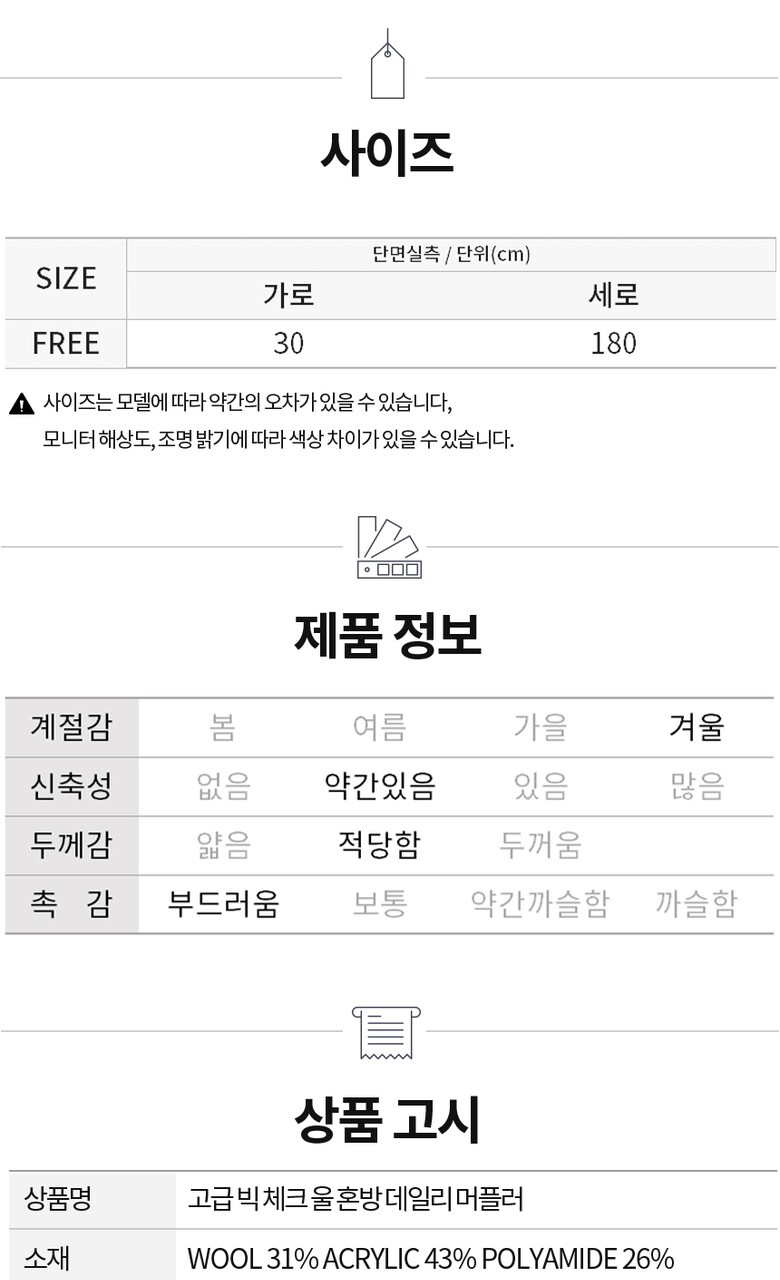 고급 빅 체크 울 혼방 데일리 머플러 MU103