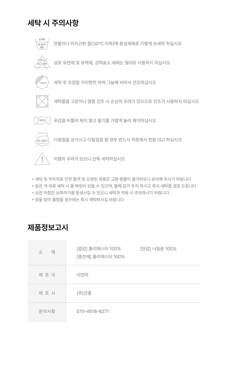 6. 세탁방법 및 취급시 주의사항 | 상세페이지 표기 |