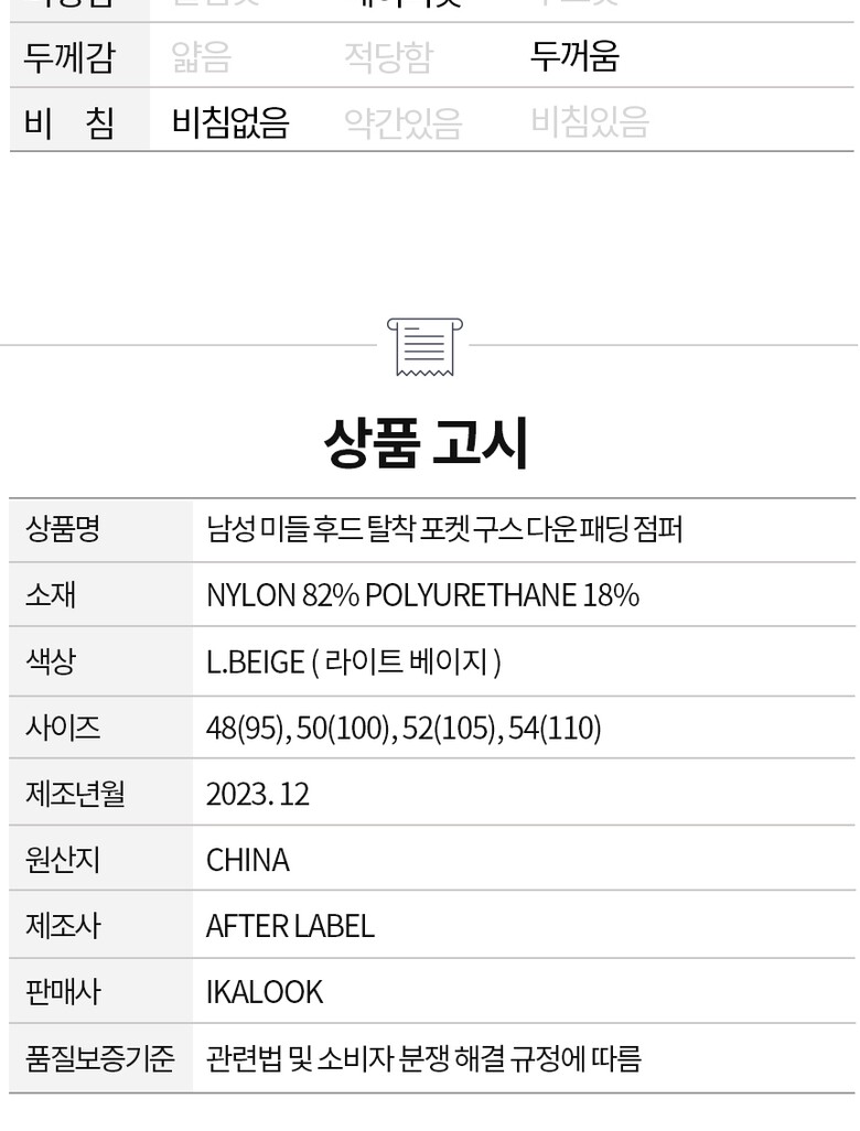 1. 제품 소재 (섬유의 조성 또는 혼용률을 백분율로 표시, 기능성인 경우 성적서 또는 허가서) | 상세페이지 참고 |