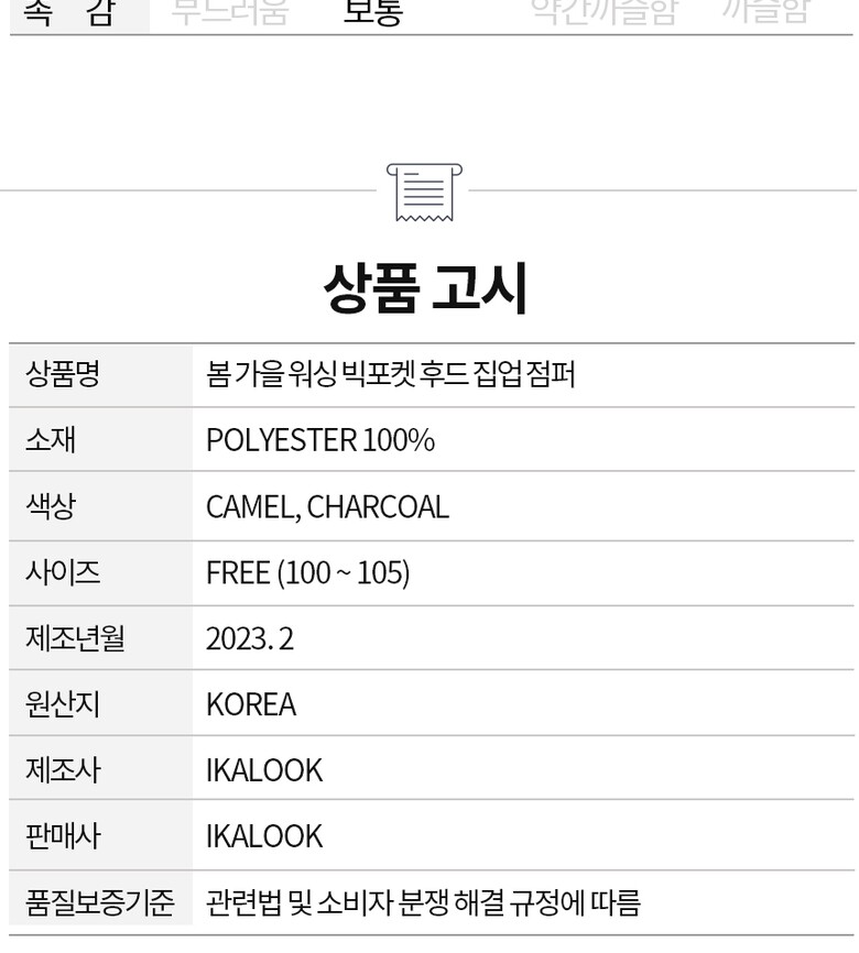 1. 제품 소재 (섬유의 조성 또는 혼용률을 백분율로 표시, 기능성인 경우 성적서 또는 허가서) | 상세페이지 참고 |