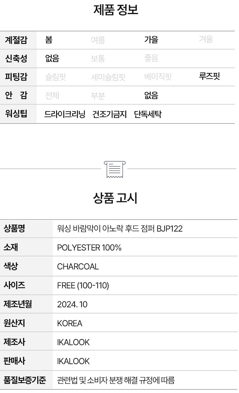 IKALOOK 워싱 바람막이 아노락 후드 점퍼 BJP122