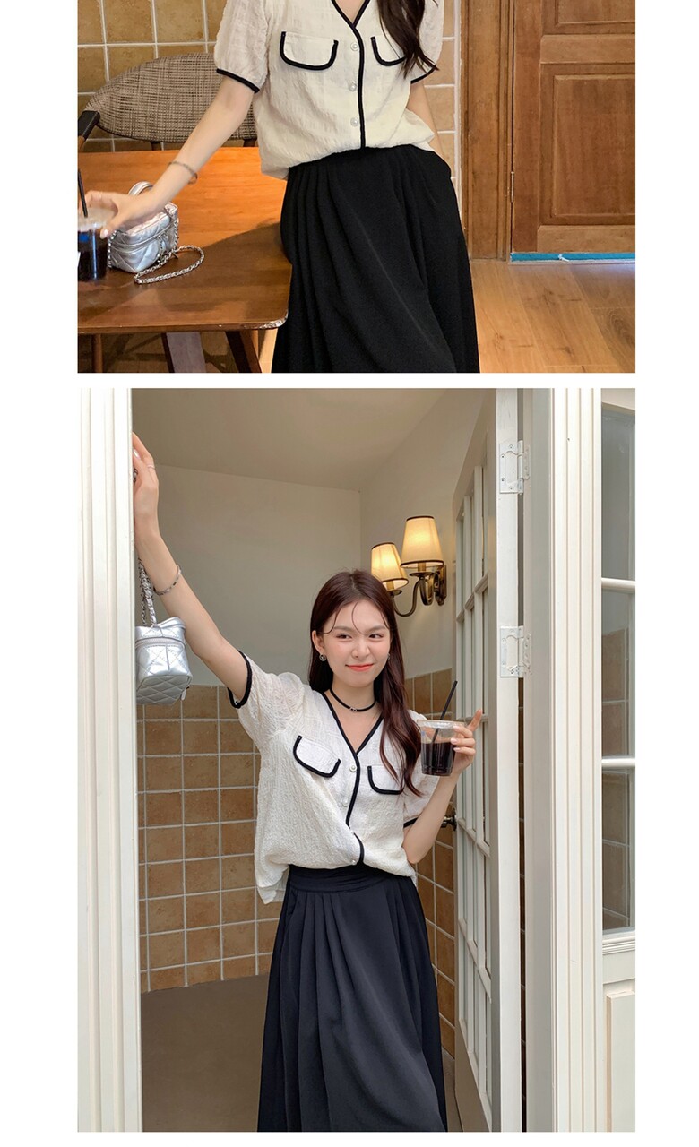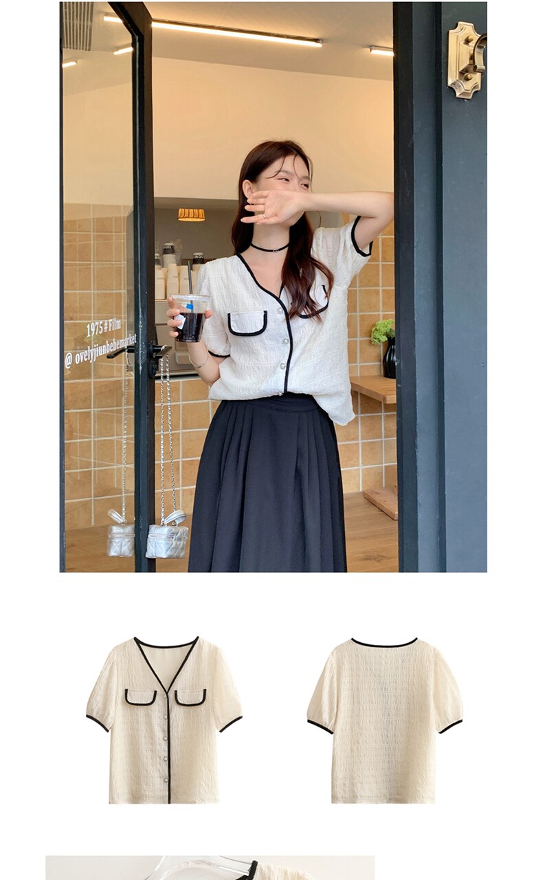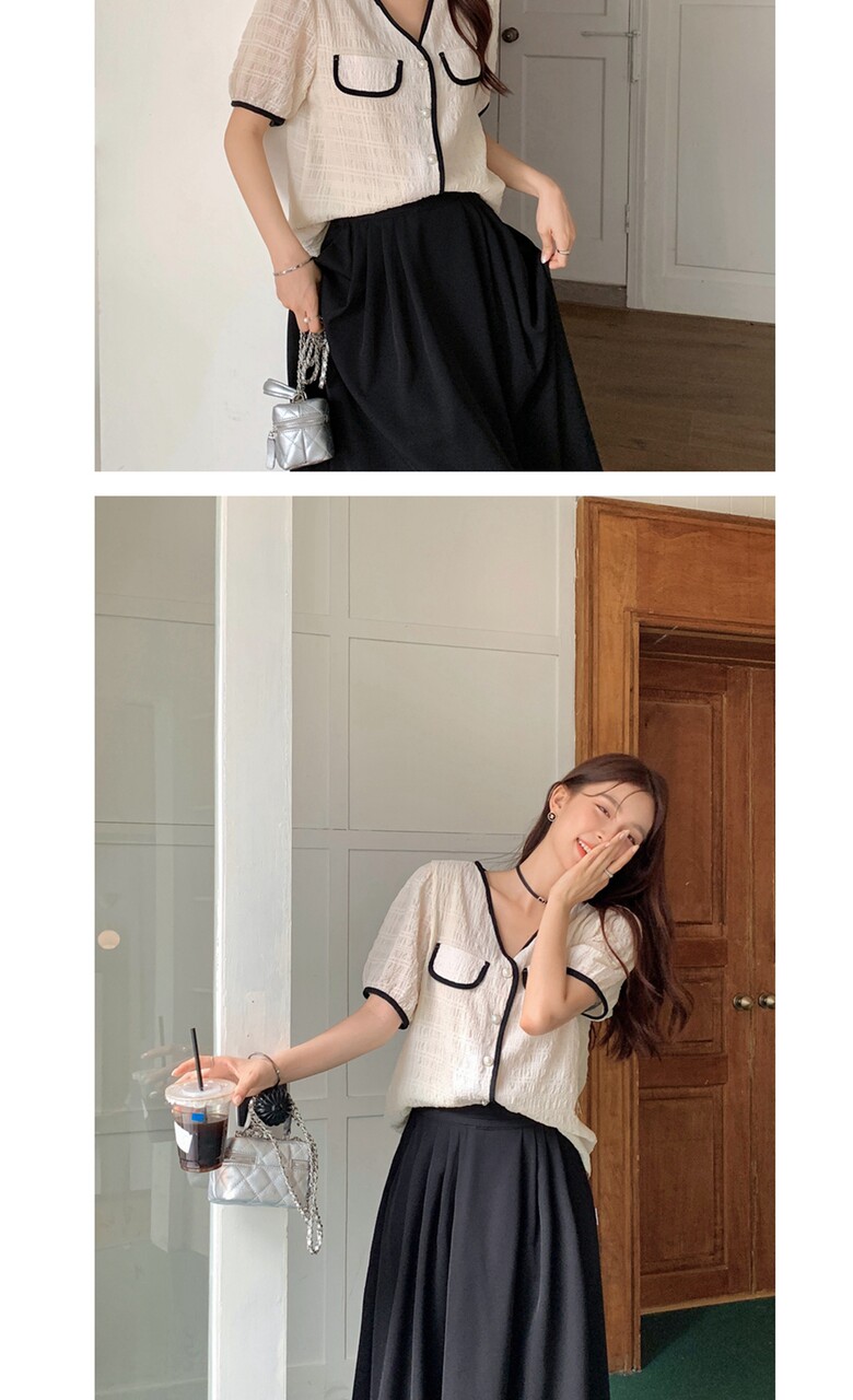 여름 브이넥 반팔 가디건 배색 여성 스런 단독 캐주얼 데일리 루즈핏 퍼프