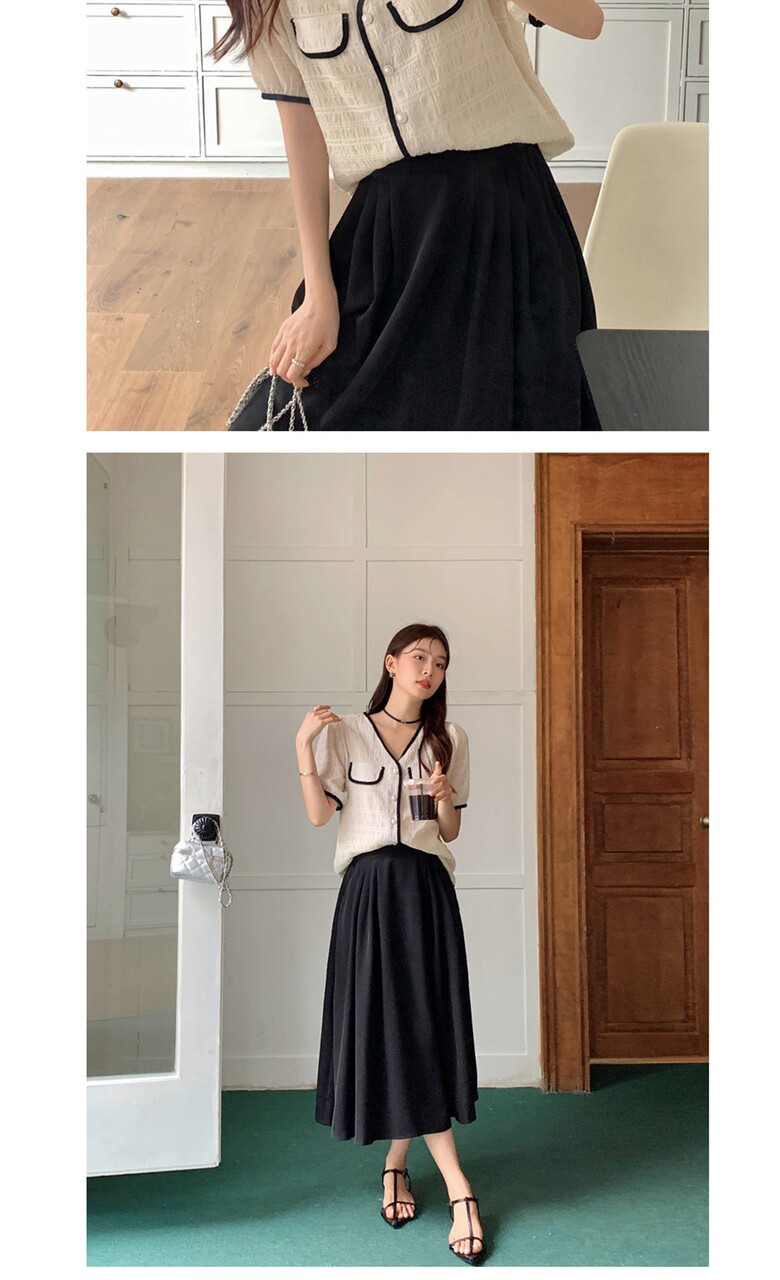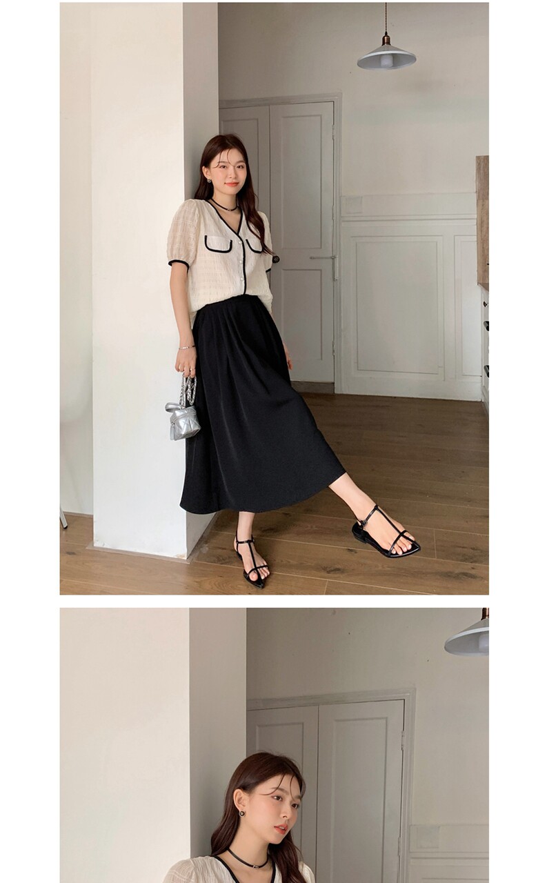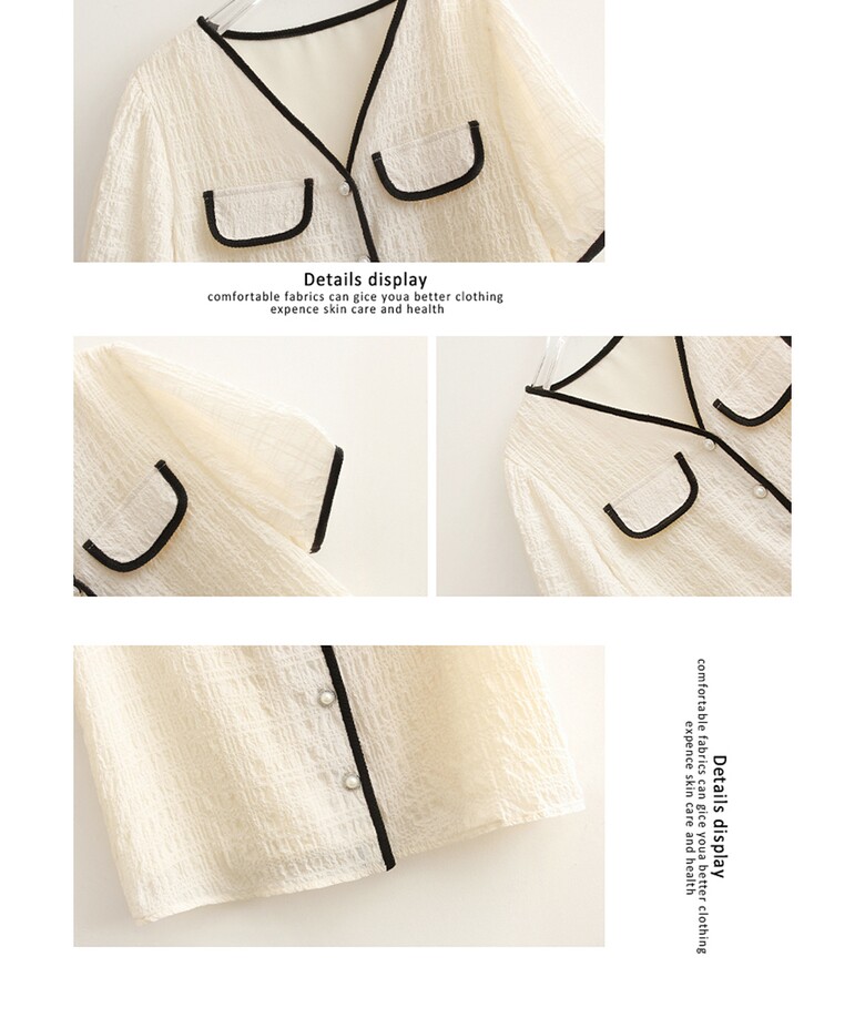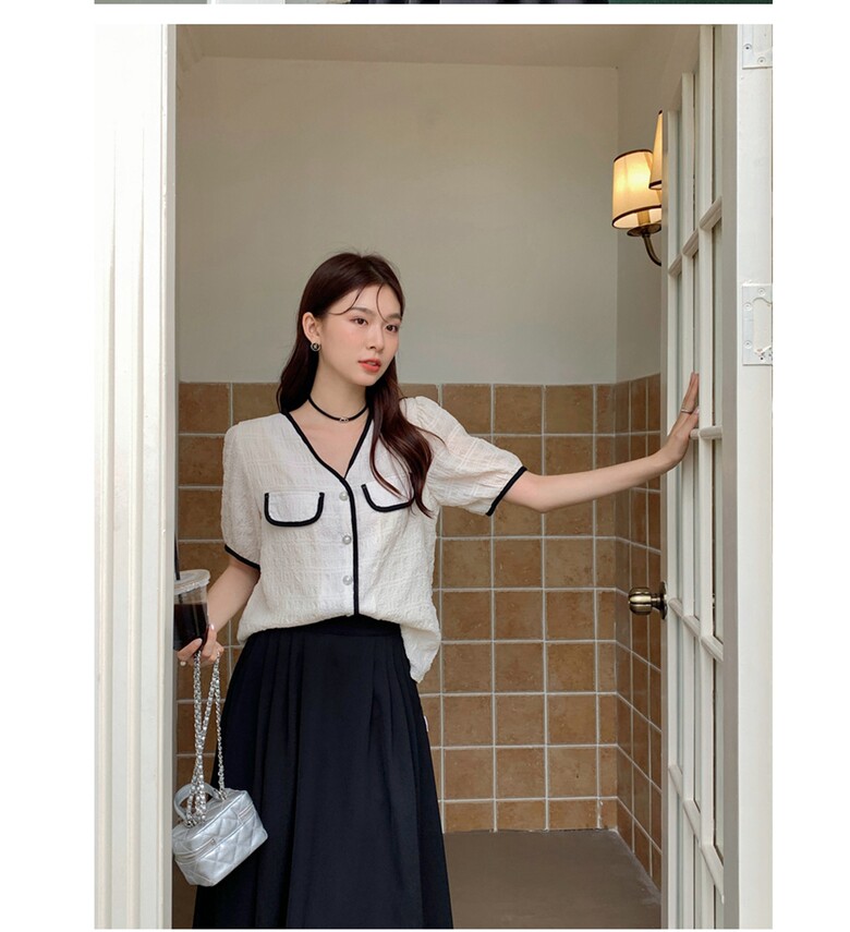 여름 브이넥 반팔 가디건 배색 여성 스런 단독 캐주얼 데일리 루즈핏 퍼프