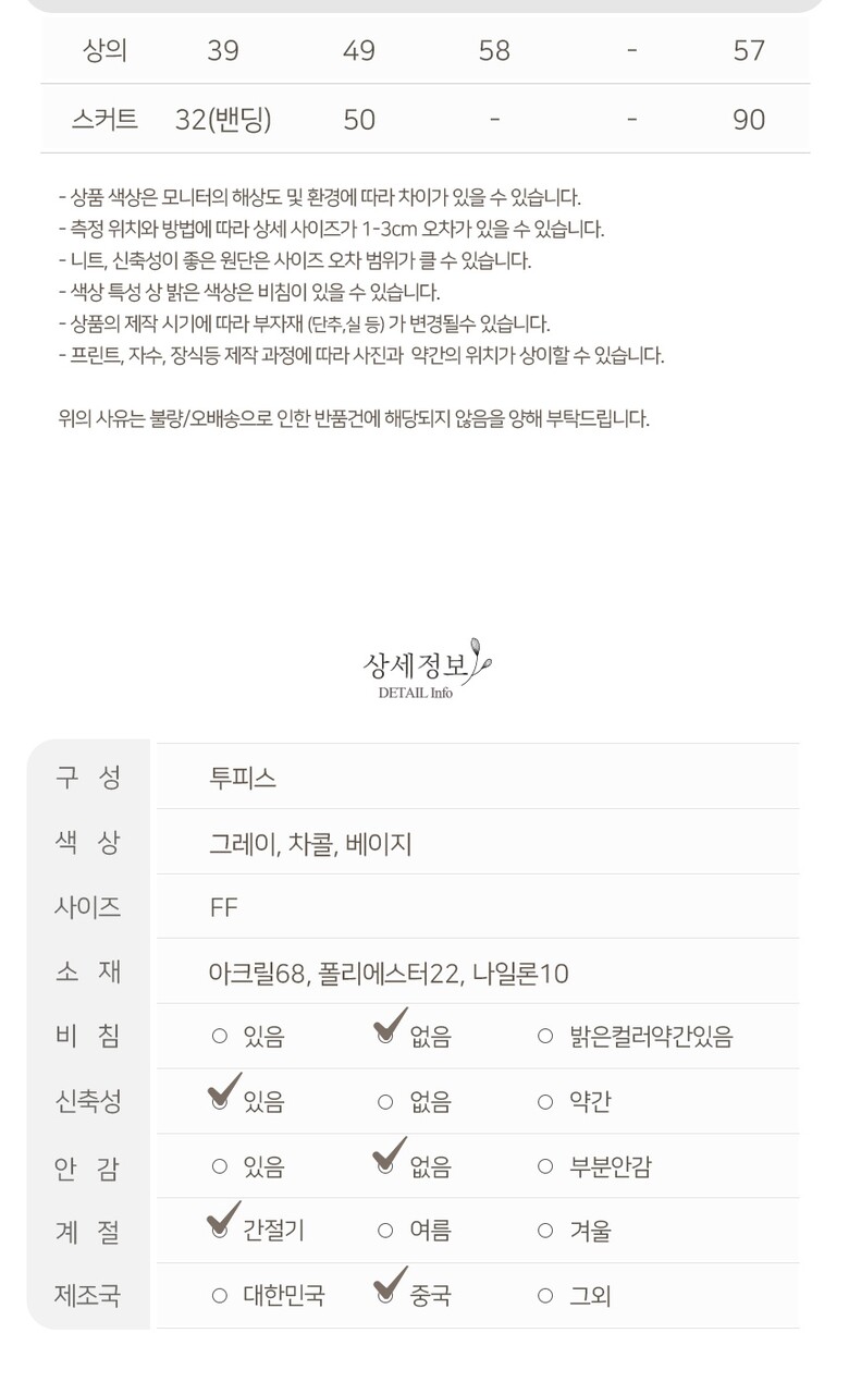 1. 제품 소재 (섬유의 조성 또는 혼용률을 백분율로 표시, 기능성인 경우 성적서 또는 허가서) | 상세페이지 참조 |
