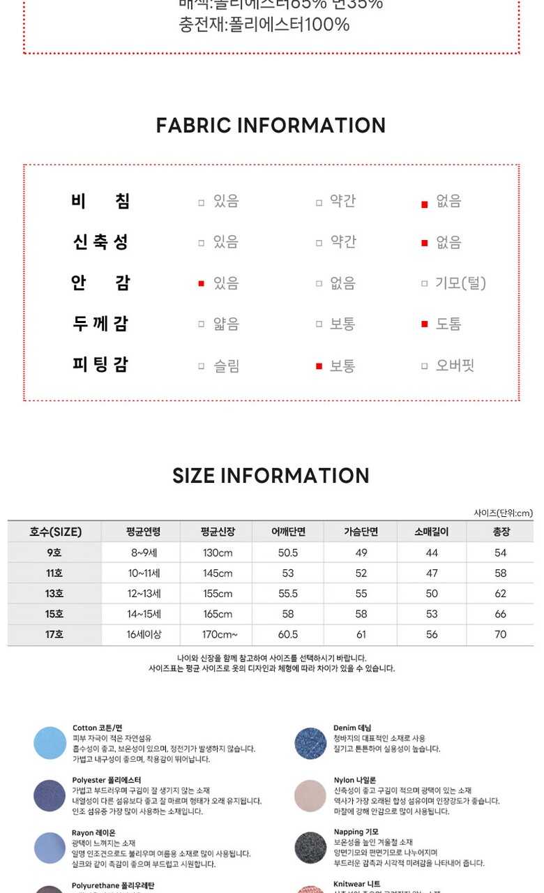 1. 제품 소재 (섬유의 조성 또는 혼용률을 백분율로 표시, 기능성인 경우 성적서 또는 허가서) | 겉감:폴리에스터100% 안감:폴리에스터100% 배색:폴리에스터65% 면35% 충전재:폴리에스터100% |