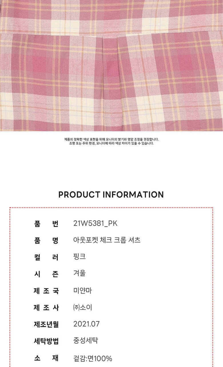 여아 아웃포켓 체크 크롭 셔츠 21W5381_PK