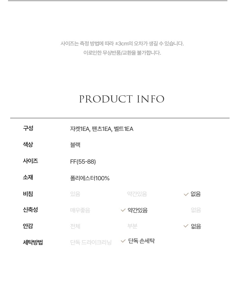 • 처음 배송된 상품상태와 다를 경우(세탁/착용 후 외출하신 경우) 반품이 불가합니다.