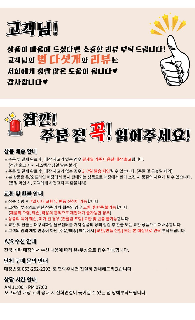 • 모든 규정은 전자상거래법에 의거하며, 택배사정으로 배송이 지연된 경우 재화를 공급받은 날로부터 7일 이내에 반품 가능합니다.