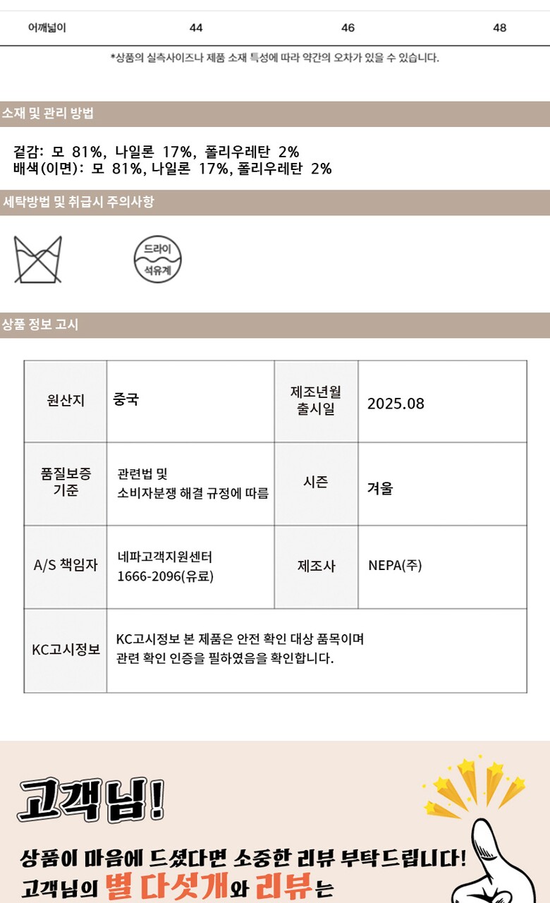 제품소재 : 겉감 모 81% / 겉감 나일론 17% / 겉감 폴리우레탄 2% / 배색(이면) 모 81% / 배색(이면) 나일론 17% / 배색(이면) 폴리우레탄 2%