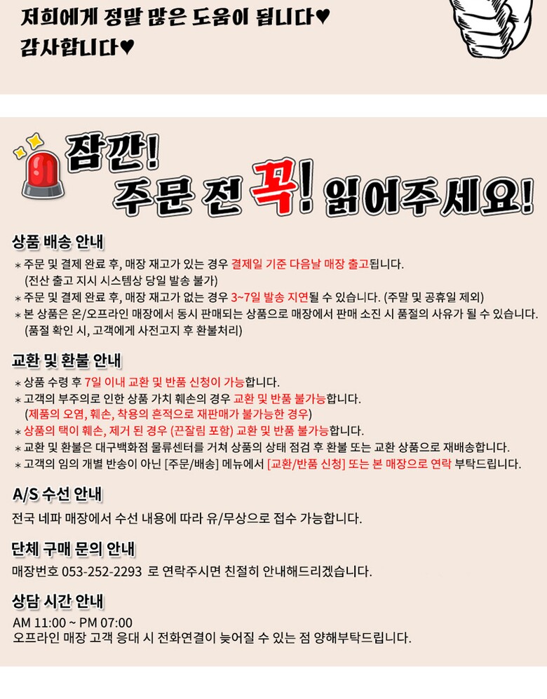 A/S 책임자와 전화번호 : AS 및 기타 문의 사항은 해당 매장 [이승재,053-252-2293] 으로 전화주시면 감사하겠습니다.