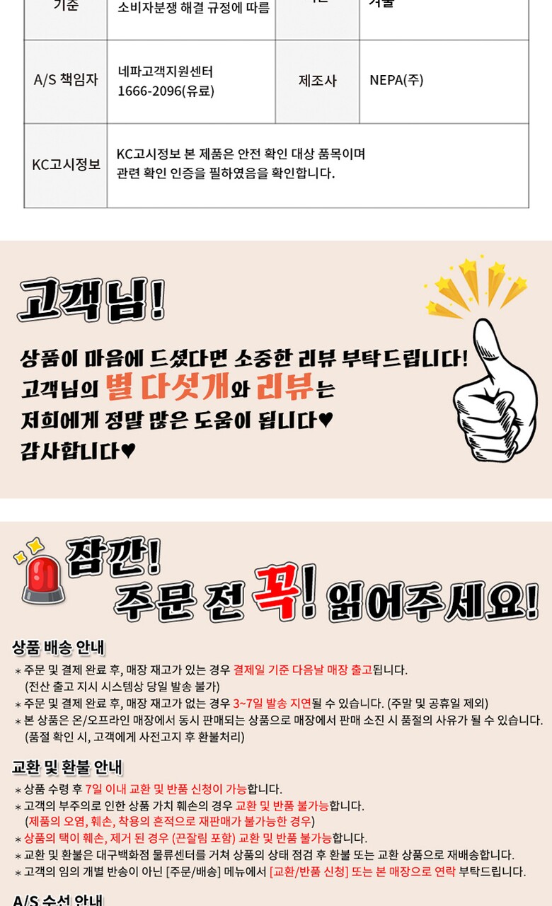 • 모든 규정은 전자상거래법에 의거하며, 택배사정으로 배송이 지연된 경우 재화를 공급받은 날로부터 7일 이내에 반품 가능합니다.