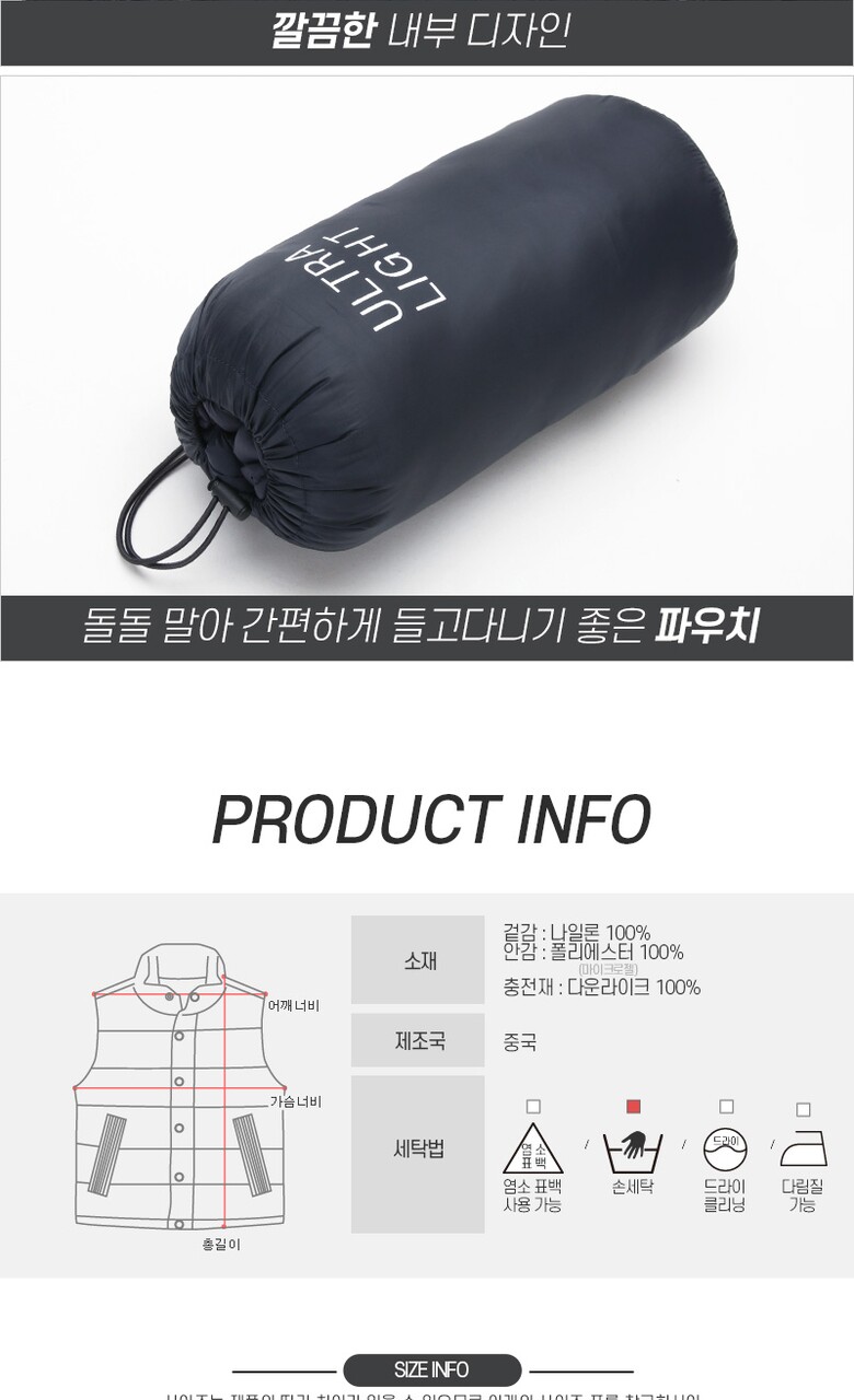 1. 제품 소재 (섬유의 조성 또는 혼용률을 백분율로 표시, 기능성인 경우 성적서 또는 허가서) | 원단: NYLON 100%, 안감: POLY 100%, 충전재: 다운라이크 100%(마이크로젤) |