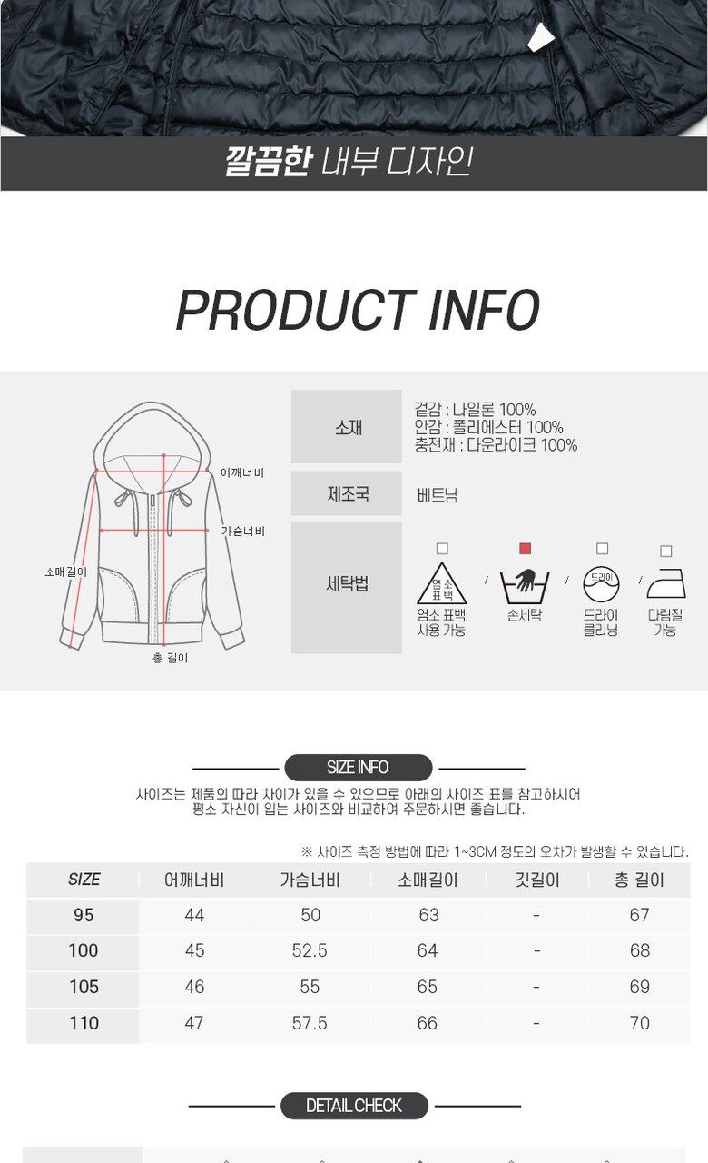 1. 제품 소재 (섬유의 조성 또는 혼용률을 백분율로 표시, 기능성인 경우 성적서 또는 허가서) 원단: NYLON 100%, 안감: POLY 100%, 충전재: 다운라이크 100%(마이크로젤)