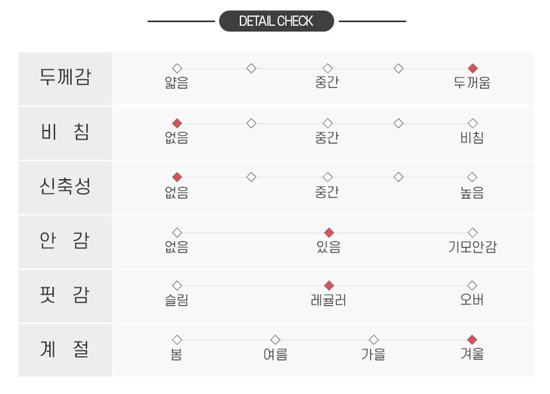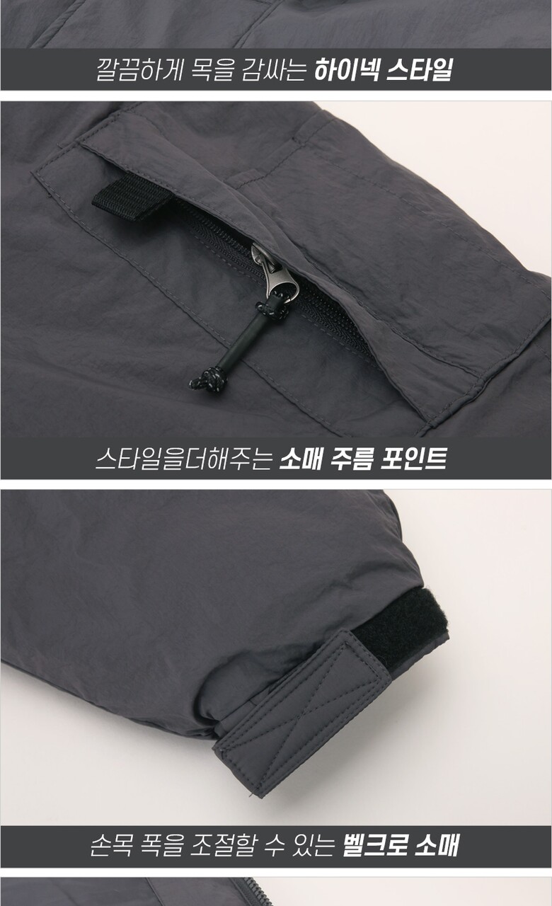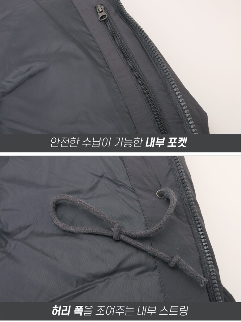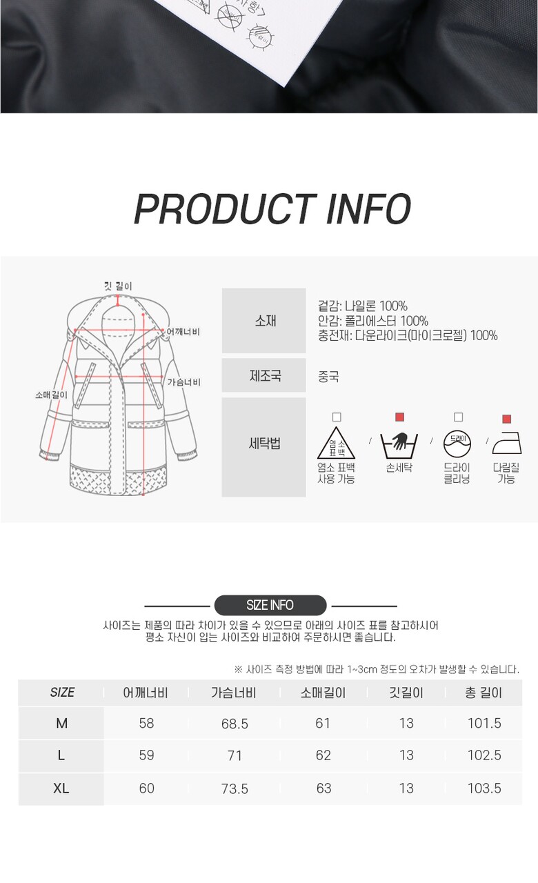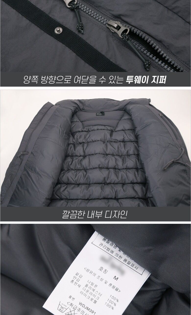 1. 제품 소재 (섬유의 조성 또는 혼용률을 백분율로 표시, 기능성인 경우 성적서 또는 허가서) | 겉감: 나일론 100%, 안감: 폴리에스터 100%, 충전재: 다운라이크 100%(마이크로젤) |