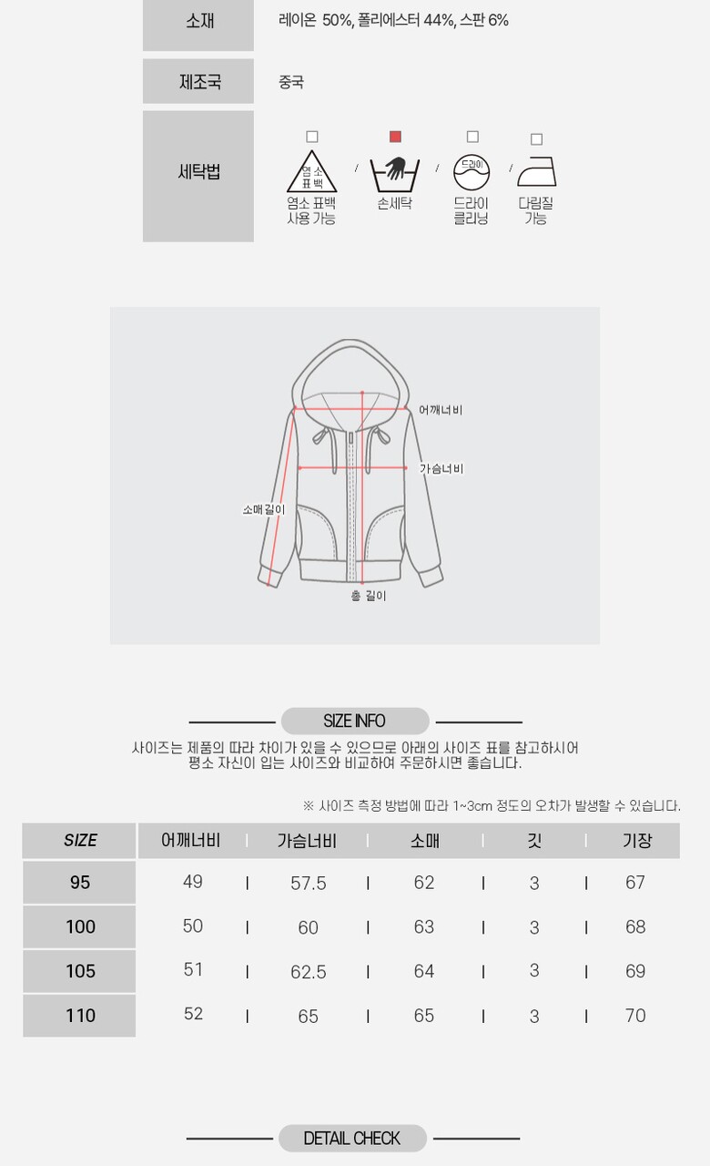 1. 제품 소재 (섬유의 조성 또는 혼용률을 백분율로 표시, 기능성인 경우 성적서 또는 허가서) | 레이온:50% 폴리에스터:44% 스판:6% |